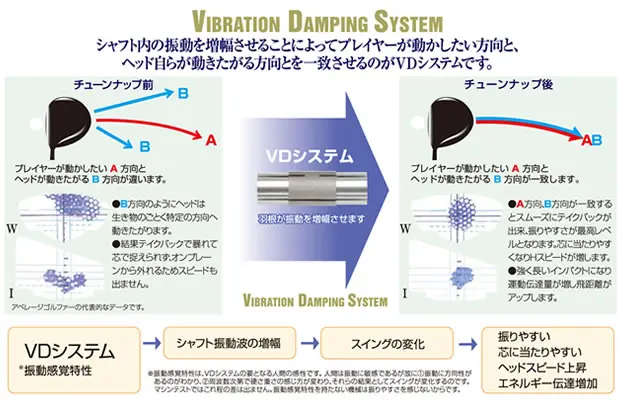 VDチップと呼ぶアルミ合金製の小さな器具をシャフト内部に装着することで、振動が増幅し制御され、最高の振りやすさを得ることができます。